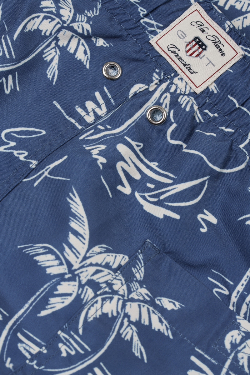 Originální pánské plavecké šortky plošně zdobené unikátní grafikou, jenž byla speciálně navržena pro danou Gant kolekci. Volný střih nohavic s délkou do půli stehen doplňuje pružný pas s všitou tkaničkou pro případné stažení. Samozřejmostí jsou dvě šikmé boční, jedna zadní nakládaná kapsa a podšívka ze síťoviny. Nechybí ani textilní label umístěn na zadní části nad efektním detailem ok, které zamezují naplnění plavek vzduchem. Pevné, avšak příjemně měkké materiálové složení je odolné vůči oděru, barevně stálé a rychleschnoucí. Velmi pohodlný kousek nápaditého vzhledu, který stylově doladí každý váš plážový outfit.