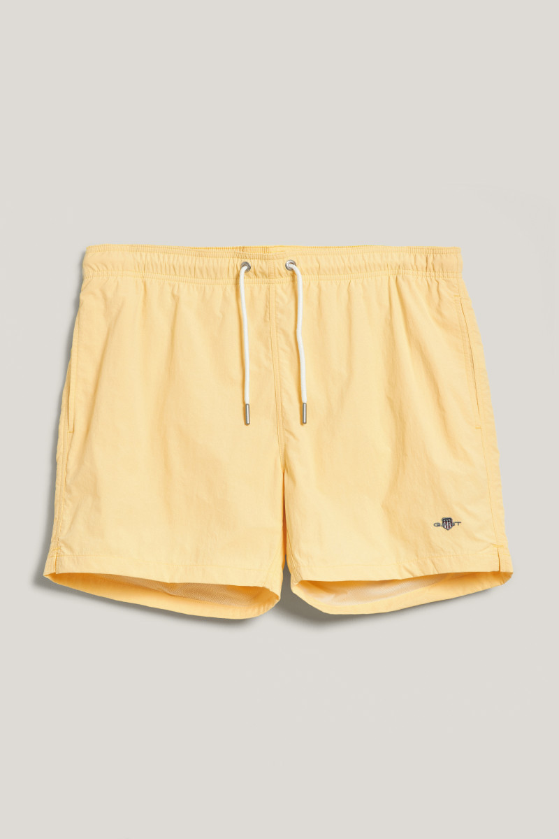 Pánské plavky s ikonickou výšivkou loga značky Gant umístěnou nad spodním lemem levé nohavice. Velmi pohodlný kraťasový střih s délkou nohavic do půli stehen doplňuje standardní výška sedu a pružný, variabilně stahovatelný pas na tkaničku. Samozřejmostí jsou dvě šikmé boční, jedna zadní nakládaná kapsa a podšívka ze síťoviny. Nechybí ani efektní detail ok umístěn na zadní části, která brání naplnění plavek vzduchem při skoku do vody. Odolné, avšak lehké materiálové složení je příjemně měkké na omak a vyniká svou rychleschnoucí schopností. Praktický artikl, bez kterého se parné letní dny u vody neobejdou.
