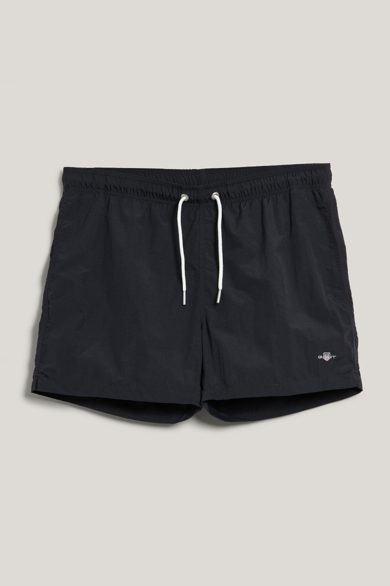 Pánské plavky s ikonickou výšivkou loga značky Gant umístěnou nad spodním lemem levé nohavice. Velmi pohodlný kraťasový střih s délkou nohavic do půli stehen doplňuje standardní výška sedu a pružný, variabilně stahovatelný pas na tkaničku. Samozřejmostí jsou dvě šikmé boční, jedna zadní nakládaná kapsa a podšívka ze síťoviny. Nechybí ani efektní detail ok umístěn na zadní části, která brání naplnění plavek vzduchem při skoku do vody. Odolné, avšak lehké materiálové složení je příjemně měkké na omak a vyniká svou rychleschnoucí schopností. Praktický artikl, bez kterého se parné letní dny u vody neobejdou.