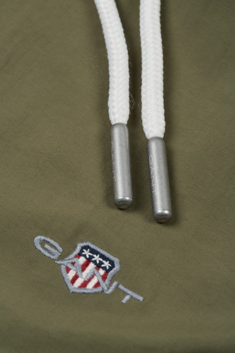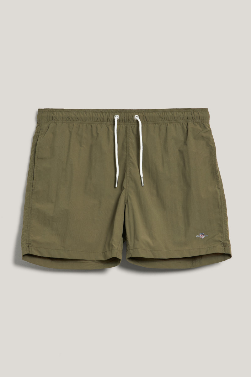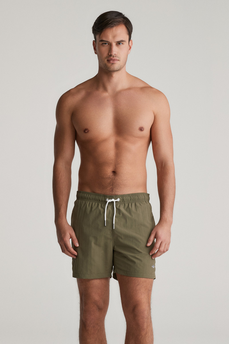 Pánské plavky s ikonickou výšivkou loga značky Gant umístěnou nad spodním lemem levé nohavice. Velmi pohodlný kraťasový střih s délkou nohavic do půli stehen doplňuje standardní výška sedu a pružný, variabilně stahovatelný pas na tkaničku. Samozřejmostí jsou dvě šikmé boční, jedna zadní nakládaná kapsa a podšívka ze síťoviny. Nechybí ani efektní detail ok umístěn na zadní části, která brání naplnění plavek vzduchem při skoku do vody. Odolné, avšak lehké materiálové složení je příjemně měkké na omak a vyniká svou rychleschnoucí schopností. Praktický artikl, bez kterého se parné letní dny u vody neobejdou.