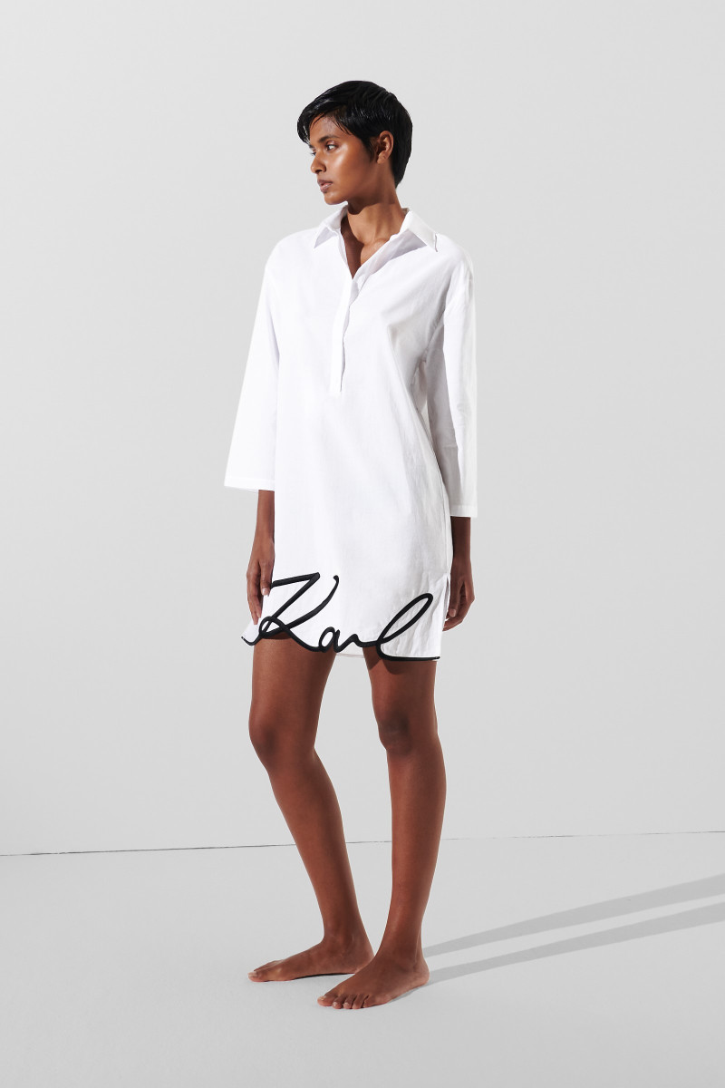 Dámské plážové košilové šaty s tříčtvrtečními rukávy v elegantním stylu. Ženská silueta má stahovací pásek, který je odnímatelný, boční rozparky a největším dominantou je vyšívaný lem KARL Signature. Zapínání v předu na knoflík.