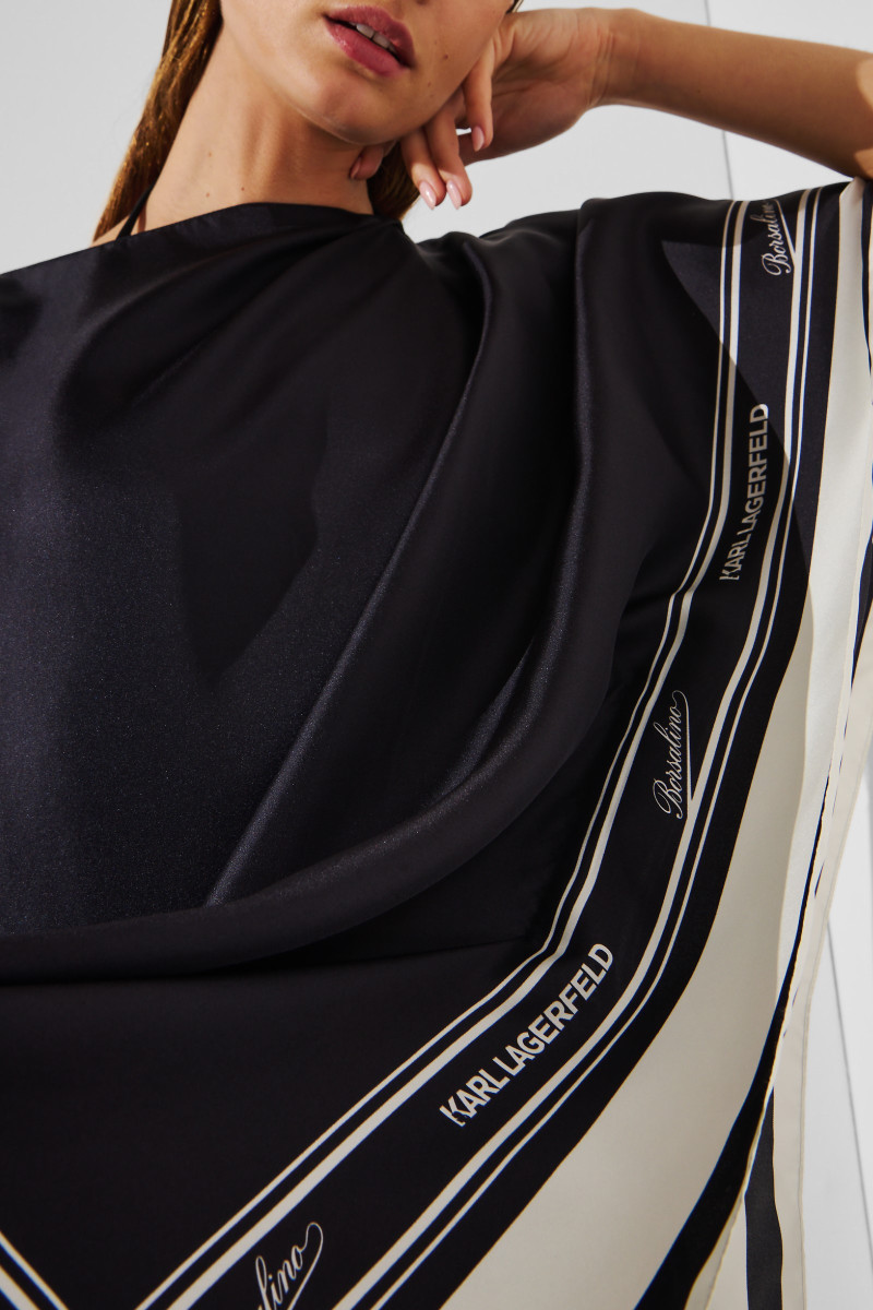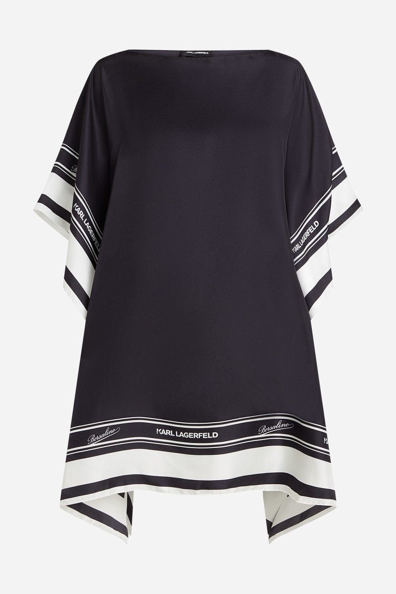 Dámská luxusní plážová tunika, která je zdobená lemováním s kontrastními okraji a logem Karl Lagerfeld. Volný, splývavý střih s kulatým výstřihem. Exkluzivní materiálové složení tvořené 100% prémiovým hedvábným vláknem se pyšní nezaměnitelným leskem a vyniká svou lehkostí a zároveň pevností. Dokonale stylový plážový kousek, který vám zpříjemní léto.
