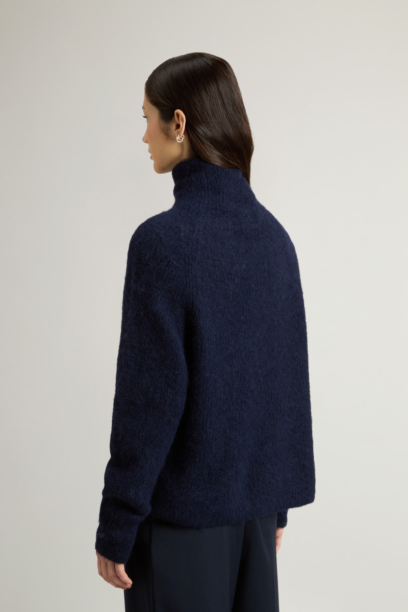 Dámský vlněný svetr s rolákem. Rovný střih s žebrovaným lemem u krku, v pase a na raglánových rukávech doplňuje decentní štítek s logem Woolrich našitý na levém boku. Kvalitní pletenina s vysokým podílem exkluzivní alpaky zaručuje dokonalou prodyšnost a skvělé termoregulační vlastnosti. Svetr je lehký, nemačká se a nepohlcuje pachy. Výborně kombinovatelný kousek, který stylově doladí váš zimní outfit.