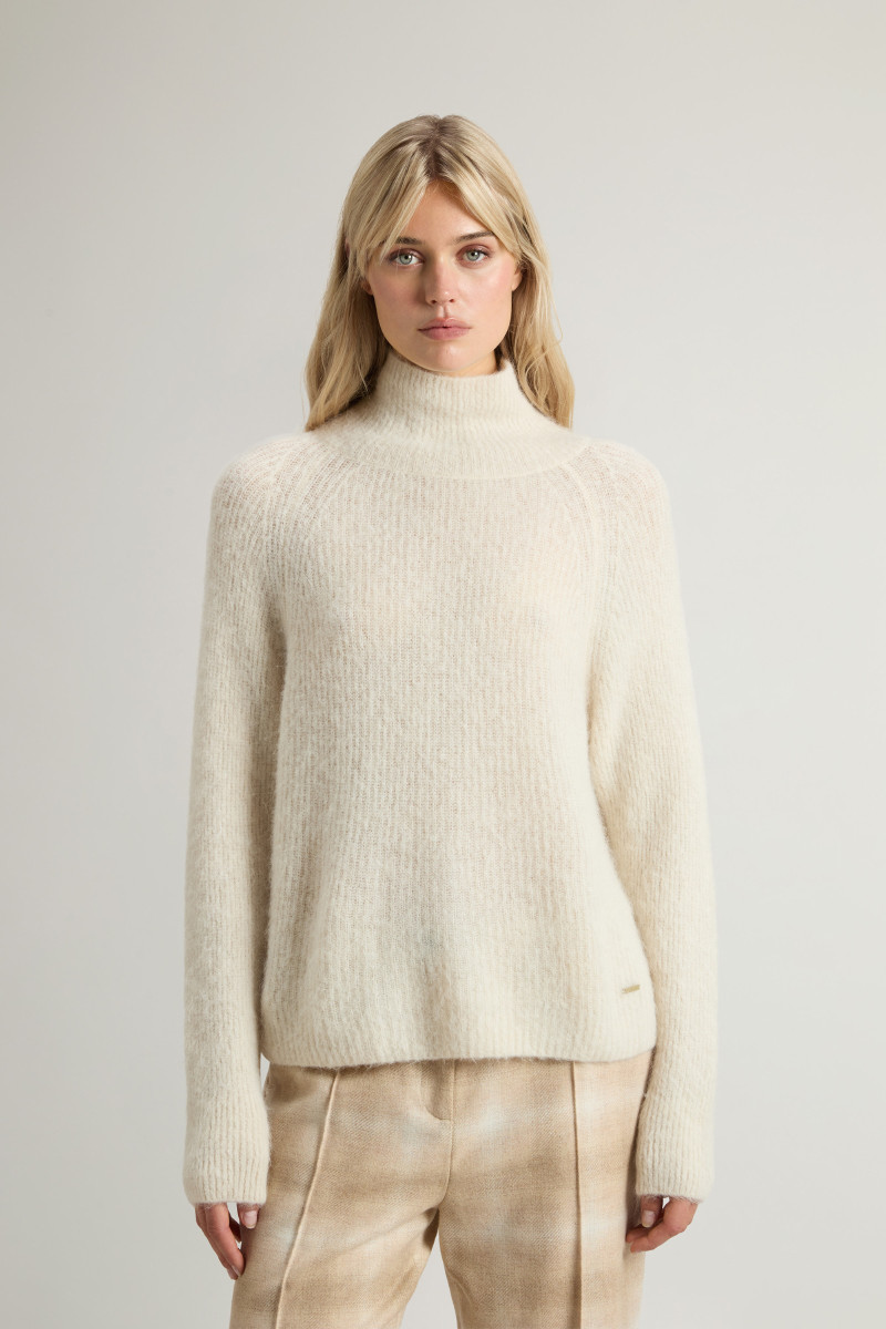 Dámský vlněný svetr s rolákem. Rovný střih s žebrovaným lemem u krku, v pase a na raglánových rukávech doplňuje decentní štítek s logem Woolrich našitý na levém boku. Kvalitní pletenina s vysokým podílem exkluzivní alpaky zaručuje dokonalou prodyšnost a skvělé termoregulační vlastnosti. Svetr je lehký, nemačká se a nepohlcuje pachy. Výborně kombinovatelný kousek, který stylově doladí váš zimní outfit.