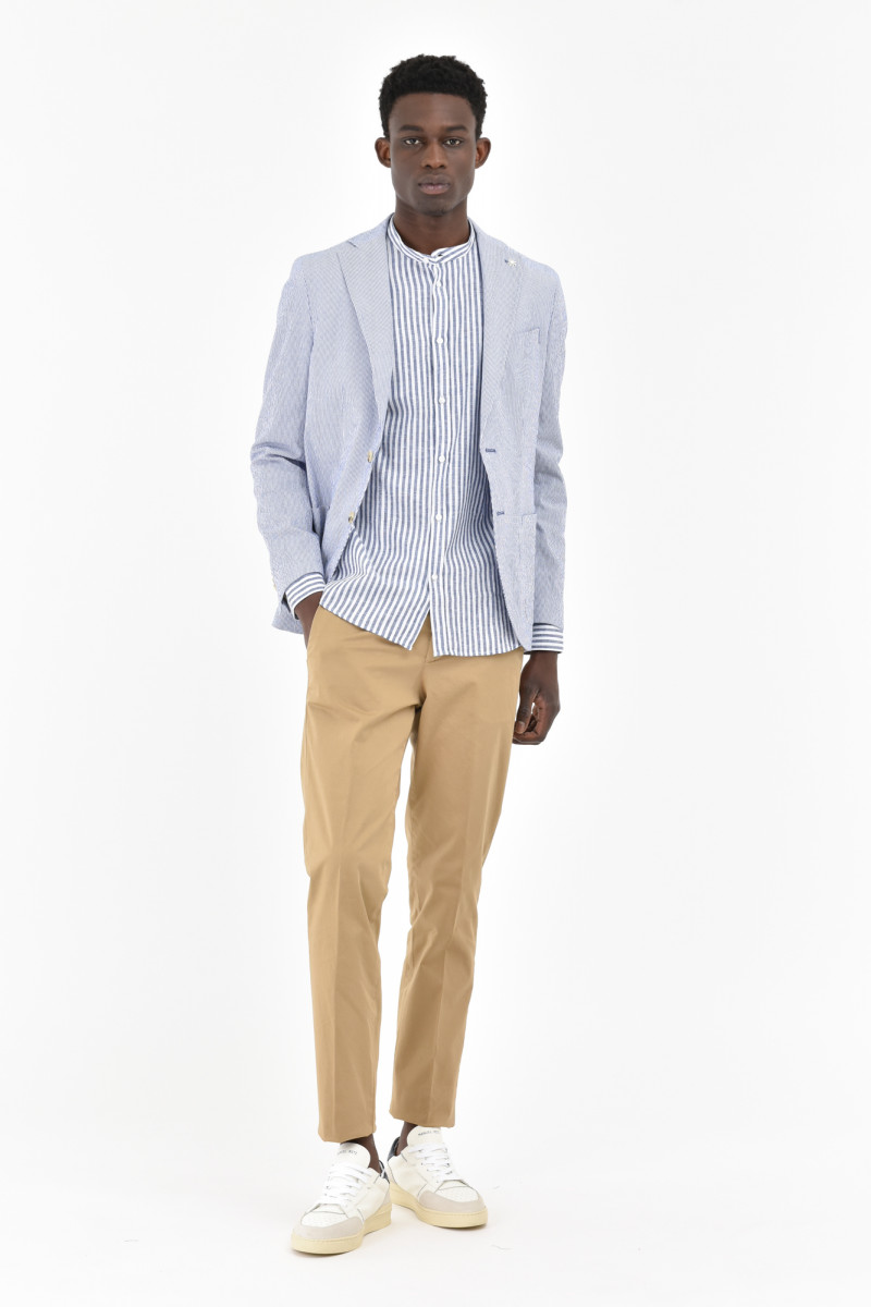 Pánské pruhované sako slim-fit střihu z kolekce Manuel Ritz. Klasické měkké klopy s kontrastně vyšitou dírkou a odnimatelným kovovým logem brandu (hvězdičkou), vnější náprsní výpustková kapsa s ozdobným kapesníčkem, dvě boční nakládané kapsy. Dva zadní rozparky, dvě vnitřní kapsy, zapínání dvěma knoflíky. Originálně řešený interiér částečně podšitého saka v ramenou a rukávech tkaninou s kamuflážovým printem. Rozparky rukávů se čtyřmi knoflíčky a tonální ozdobné prošití obvodu klop a kapes. Příjemně měkký, dokonale prodyšný materiál krepového vzhledu prémiové kvality je zárukou vysokého komfortu v průběhu nošení. Ideální letní, ležérně-elegantní artikl, který můžete doplnit kalhotami ze stejné kolekce a získat tím krásný oblek.