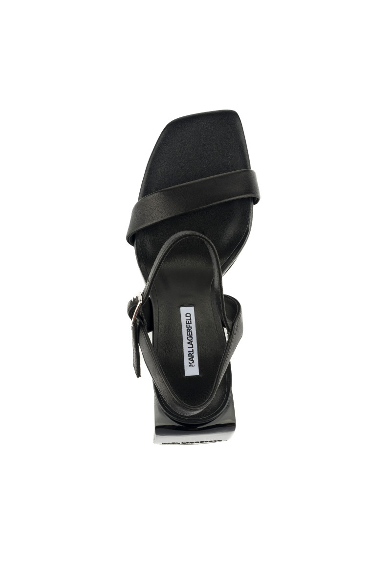 Dámské sandály z hladké usně prémiové kvality, které vás zaujmou svým exkluzivním vzhledem a originálními detaily. Elegantní design s otevřenou špičkou zkoseného tvaru a vysokým tvarovaným podpatkem doplňuje nastavitelný kožený řemínek s kovovou sponou zdobenou přívěskem monogramu KL. Interiér je opatřen koženou stélkou. Nezaměnitelně stylová obuv, která bude ozdobou vašeho denního i večerního outfitu.