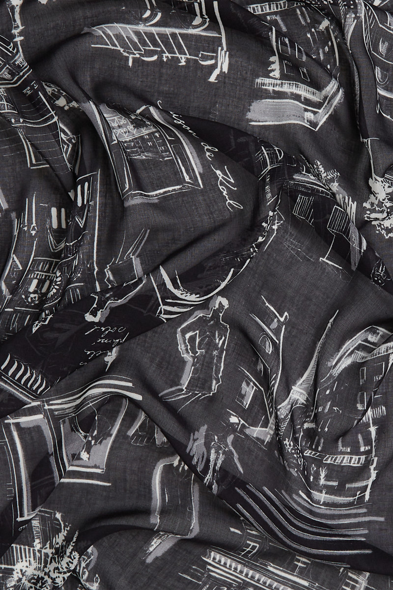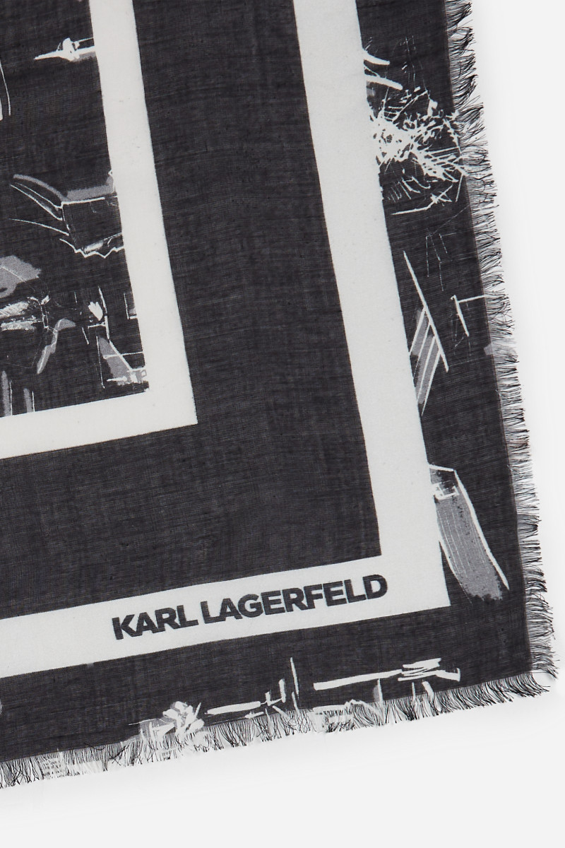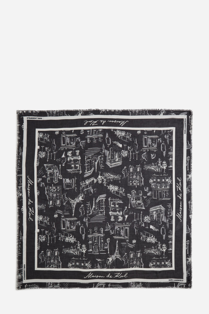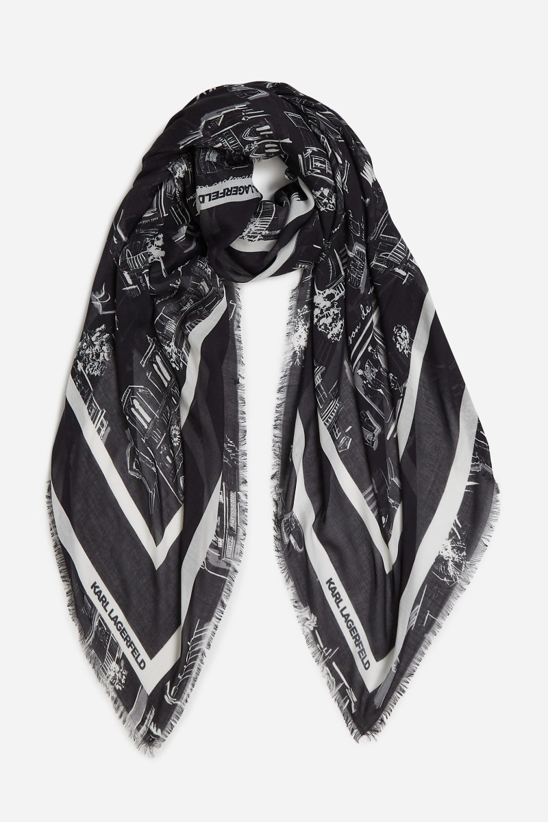 Dámská šátek, která je ozdobena celoplošným motivem inspirovaným Paříží. Okraj s nezačištěným lemem zdobí krátké střapce a kontrastní lem s logem Karla. Odolné, avšak jemné a na dotek sametově hebké materiálové složení tvoří kombinace prémiového modalu a luxusního hedvábí, které tomuto unikátnímu kousku dodává půvabný lesk. Tento luxusní doplněk, který vás nikdy neomrzí, nabízí mnoho variant nošení. Každému vašemu outfitu dodá neopakovatelný šarm, ať ho uvážete kolem krku, přes pas nebo na ucho vaší oblíbené kabelky.