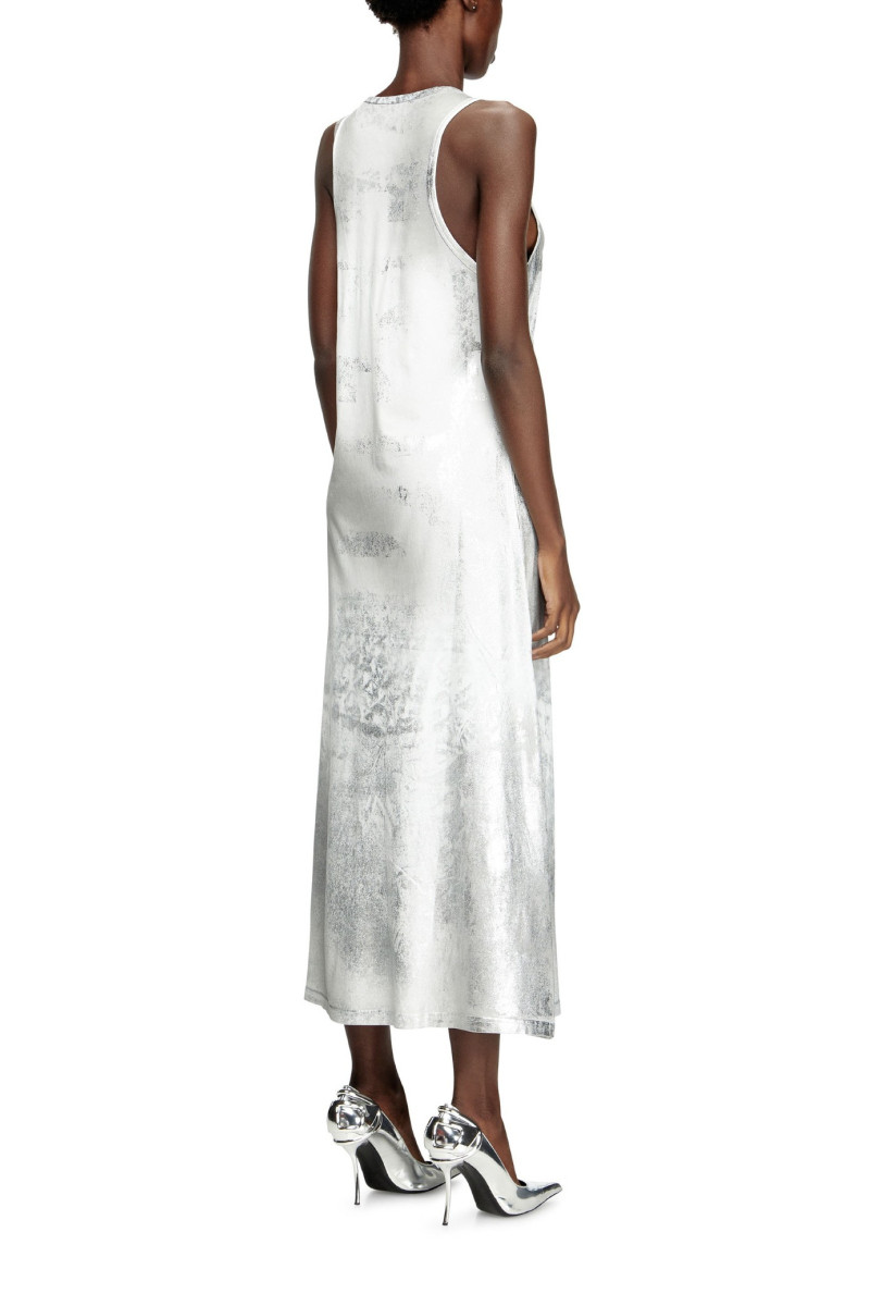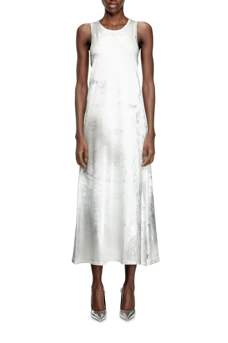 Dámské maxi šaty bez rukávů. Úzký střih s mírně áčkovou sukní. Speciálně upravené pro mramorově lesklý efekt. Kontrastní páska s logem Diesel na lemu. Vyrobeno z měkkého bavlněného žerzeje.  Modelka má na sobě velikost S a měří 175 cm. Velikost odpovídá běžnému značení, při výběru prosím zvolte svou běžnou velikost.
