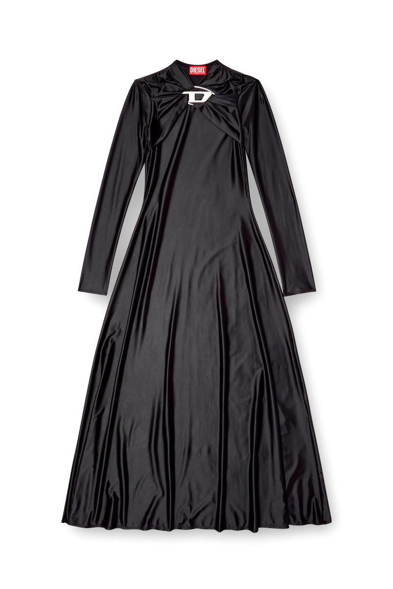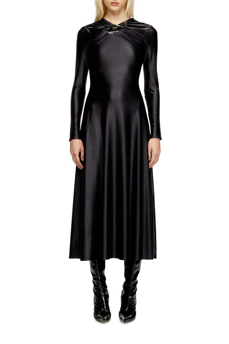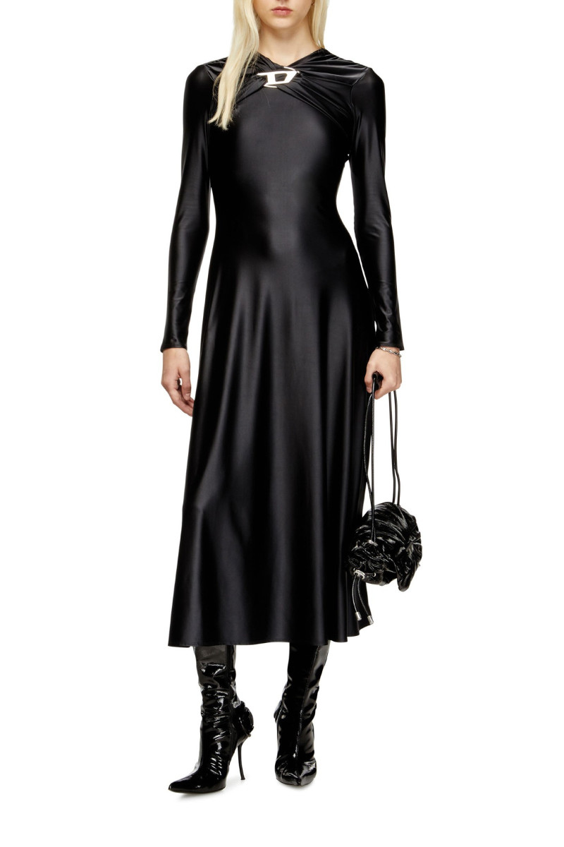 Dámské midi šaty. Přiléhavý střih skinny fit je doplněn dlouhými rukávy a sukní v áčkovém střihu. Šaty jsou z lehce splývavého materiálu, zdobené kovovým logem Oválné D na hrudi. Midi délka potvrzuje aktuální trend. Materiálové složení je tvořeno lehkou a lesklou syntetickou tkaninou. Modelka má na sobě velikost S a měří 175 cm.