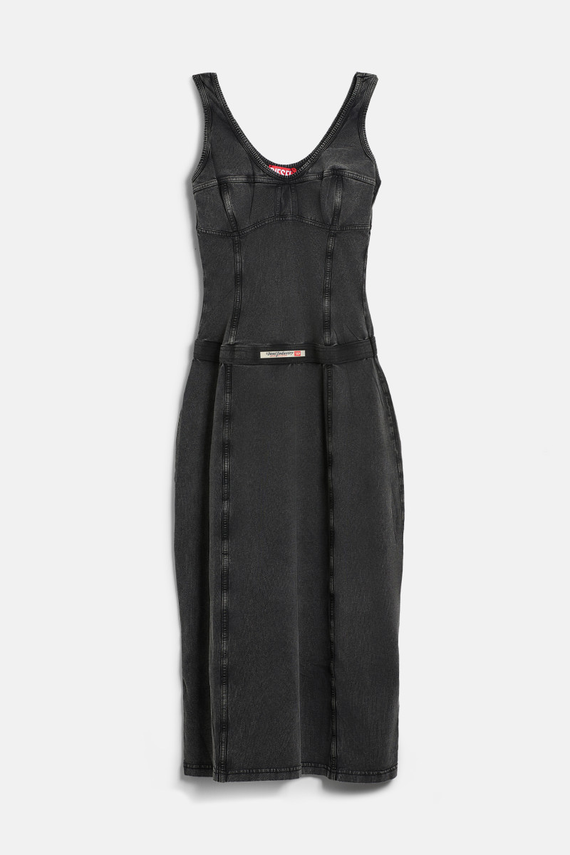 Dámské midi šaty. Úzký slim fit střih s véčkovým výstřihem a délkou pod kolena. Vyrobeny ze strečového bavlněného žerzeje upraveného tak, aby připomínal vybledlou džínovinu. Design inspirovaný stylem spodního prádla. Doplněny lemováním podobným jako na podprsence. Elastický pas zdobený puncem ikonického štítku s logem páté kapsy Diesel. Bez podšívky. Modelka má na sobě velikost S a měří 175 cm. Velikost odpovídá běžnému značení, při výběru zvolte své obvyklé číslo.