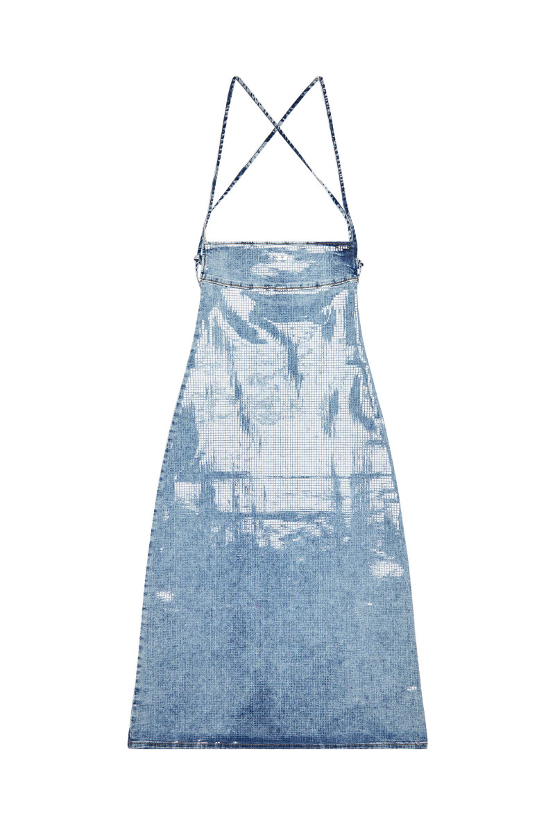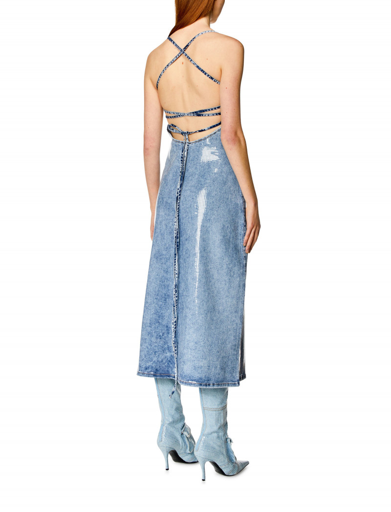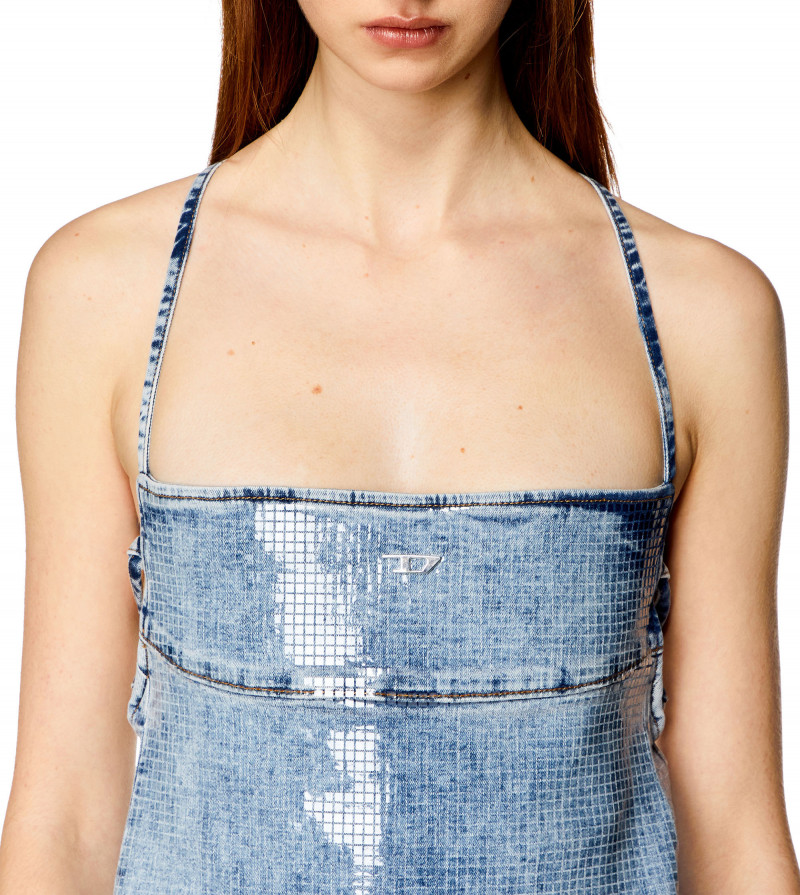 Dámské šaty v midi délce. Zajímavé zavazování s detailem na zádech, jsou pro moderní ženy, které chtějí zůstat stylové. Oválné logo D na přední straně. Mírně elastický materiál je doplněn speciálním průhledným fóliovým čtvercovým střihem, který vytváří celoplošný flitrový efekt. Střih šatů s detaily dělá z šatů velmi zajímavý a stylový kousek do vašeho šatníku.