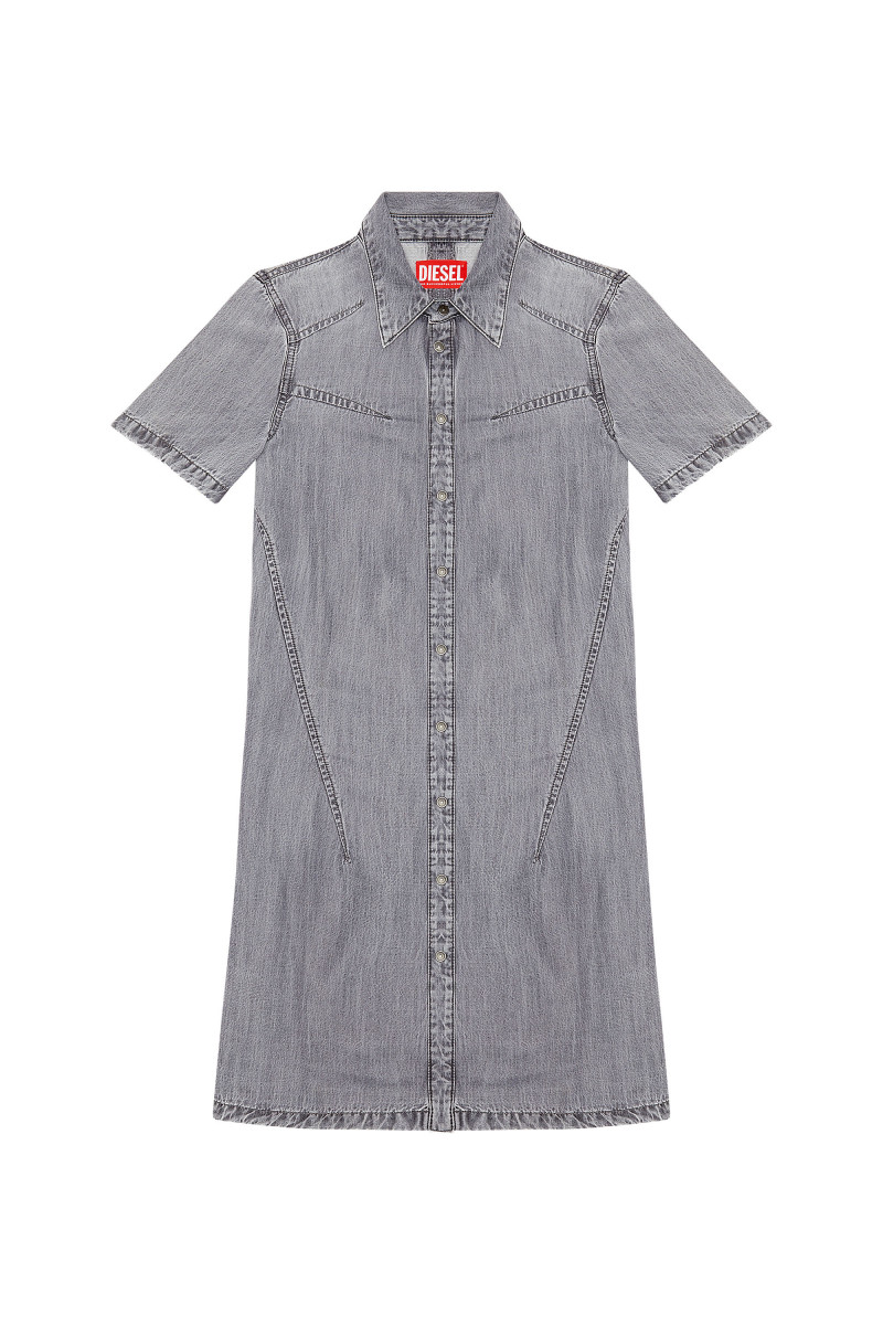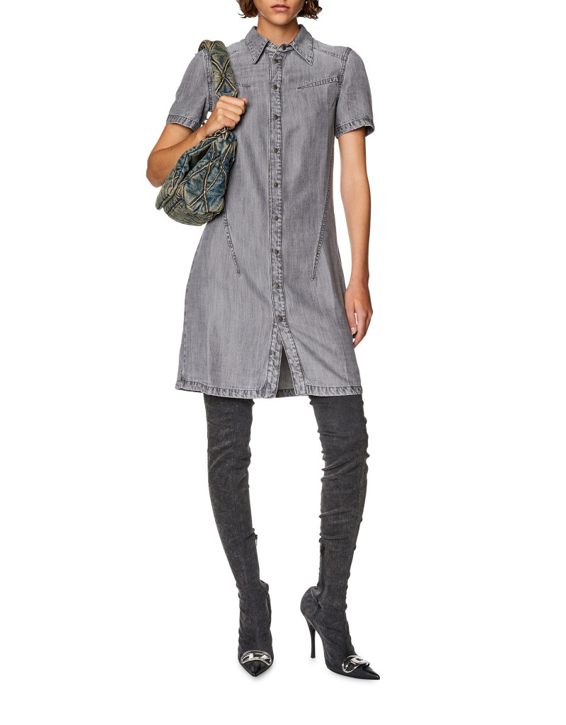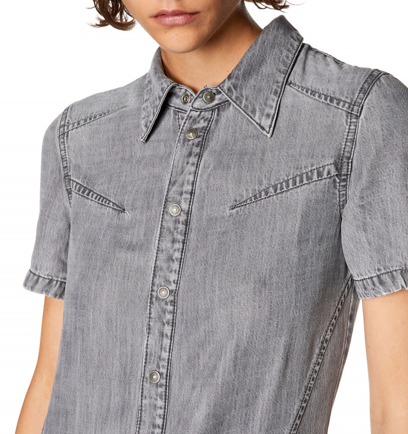 Dámské košilové šaty s krátkým rukávem. Užší silueta se zapínáním po celé délce na spínací knoflíky. Vyrobeno z lyocelu šedé barvy s lehkou a měkkou texturou. Bez podšívky. Velikost odpovídá běžnému značení, při výběru zvolte své obvyklé číslo.