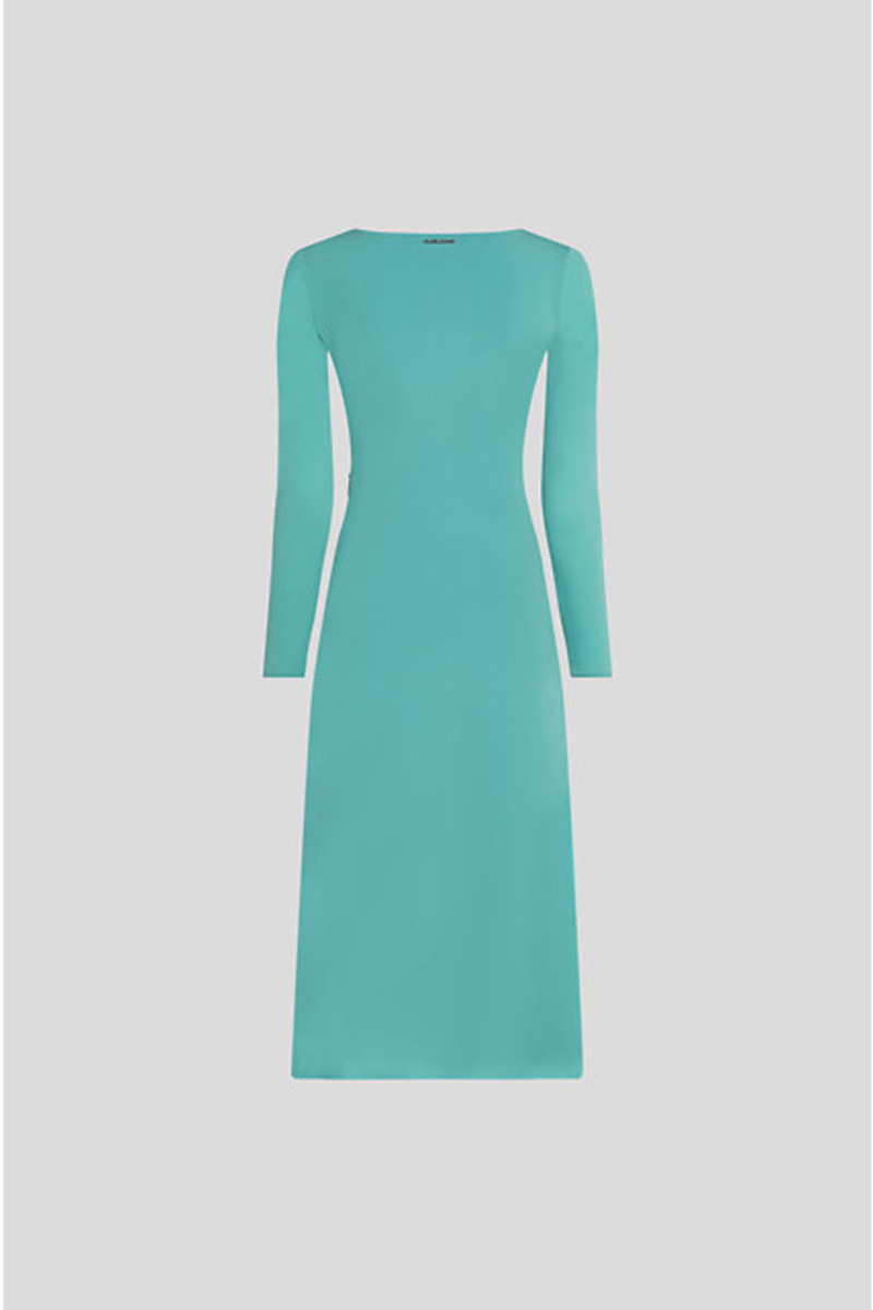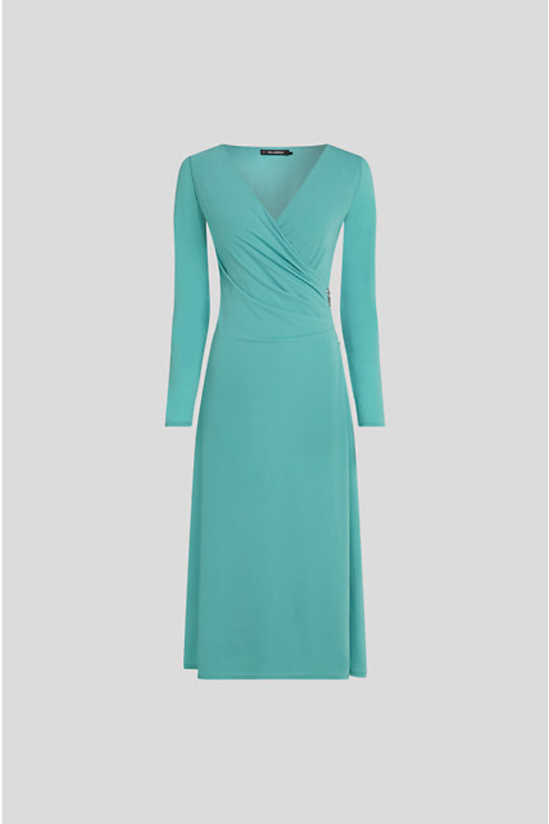 Exkluzivní dámské šaty s dlouhými rukávy a výstřihem do V. Rovný střih se zavinovací siluetou a rafinovaným řasením vpředu pro dokonalé zvýraznění ženské siluety. Sukně v délce do půlky lýtek. Splývavé, příjemně měkké materiálové složení prémiového původu zaručuje dokonalou vzdušnost a velmi příjemný pocit během nošení. Ležérně-elegantní kousek, který je vhodný téměř na jakoukoliv společenskou událost a ve kterém vynikne váš ženský šarm a půvab.