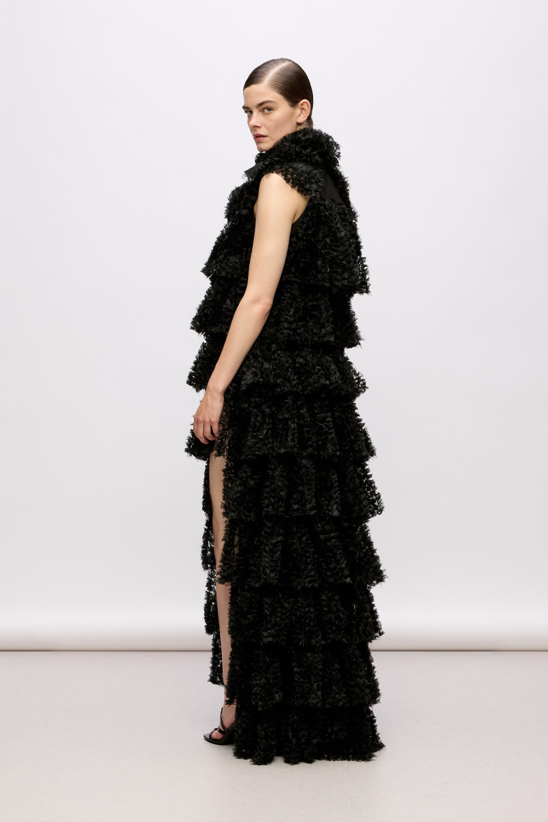 Dámské maxi šaty bez rukávů s elegantním vysokým límcem. Večerní šaty s celoplošnými volánky tvarovanými do jemných vln. Materiálové složení zaručuje dokonalou splývavost, lehkost a příjemný pocit při nošení. Šaty jsou díky svému střihu exkluzivní a zároveň působivě ženské a originální. Velmi stylový kousek, který bude ozdobou každého vašeho elegantního outfitu.