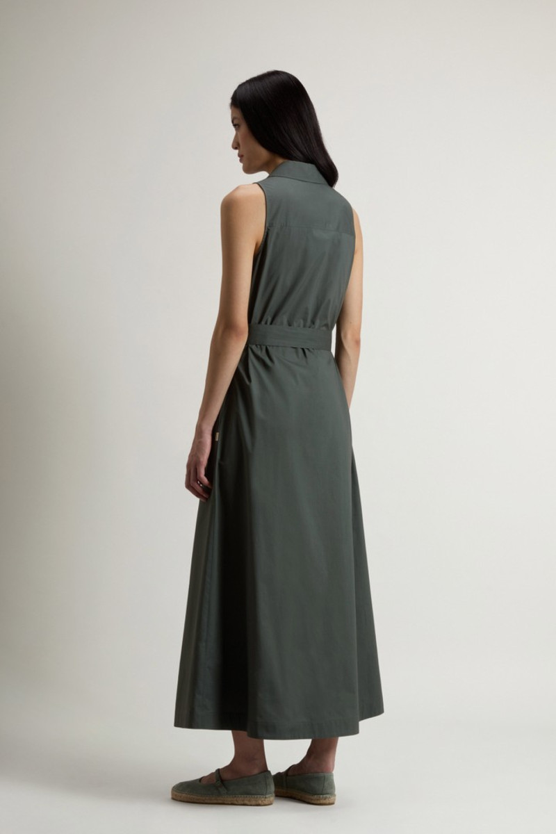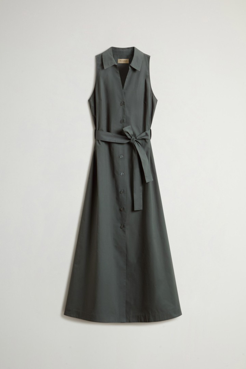 Dámské košilové šaty bez rukávů v midi délce do půli lýtek. Jednobarevný design s límečkem, výstřihem do V a zapínáním na knoflíky doplňuje tonální stuha na zavazování v pase. Nechybí decentní label s logem Woolrich umístěný v levém bočním švu. Hladká popelínová tkanina z prémiové bavlny zaručuje dokonalou prodyšnost, lehkost a příjemný pocit při nošení. Velmi stylový kousek, který bude ozdobou vašeho letního outfitu.
