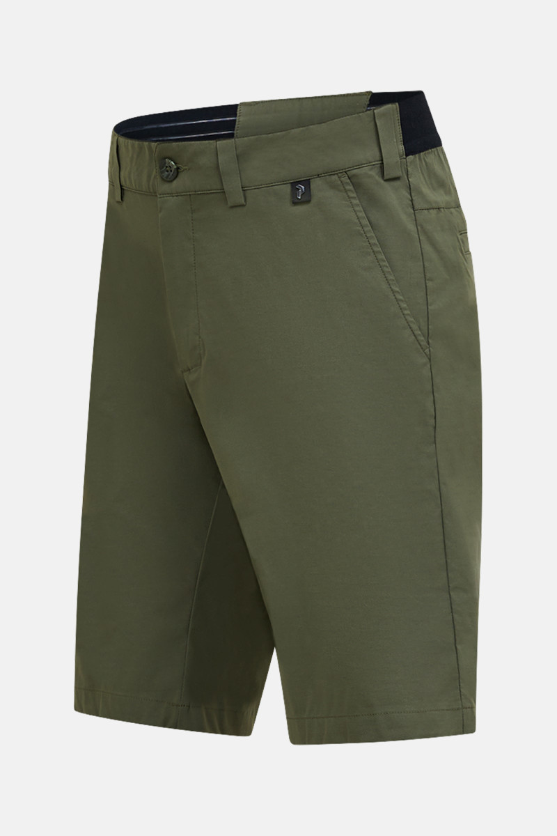 Pánské šortky chino střihu. Kalhotové zapínání na knoflík z kvalitním rohoviny a poutky na pásek, vzadu elastický pas s protiskluzovým potiskem na vnitřní straně, boční otevřené kapsy, zadní výpustkové kapsy, na boku našitý štítek značky. Šortky jsou vyrobeny z velmi příjemného a pružného materiálu, který byl vyroben z částečně recyklovaných syntetických vláken. Materiálové složení a celkové zpracování zaručují dokonalý komfort během nošení a skvělé funkční vlastnosti. Velmi praktický a stylový kousek vhodný nejen na golf.