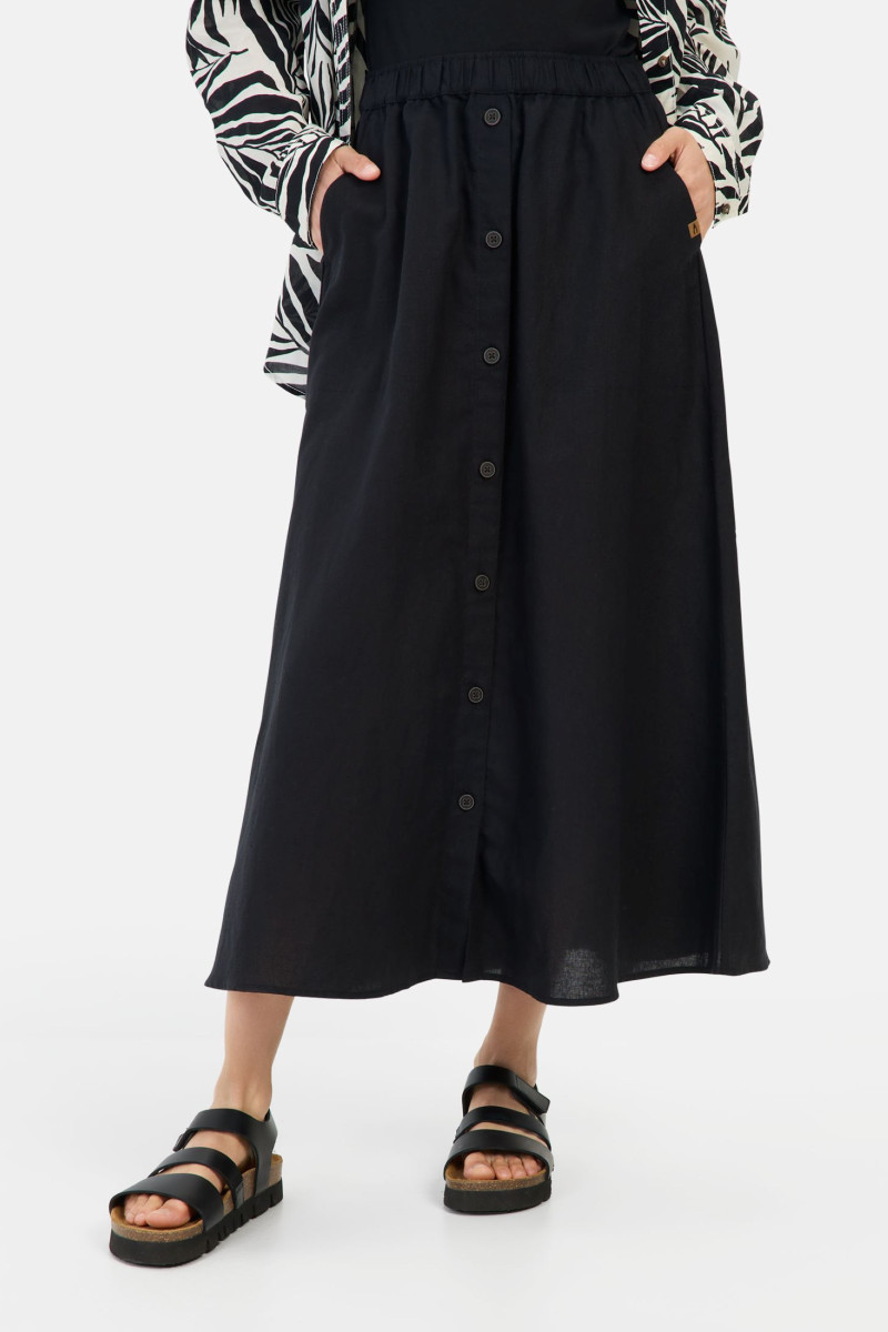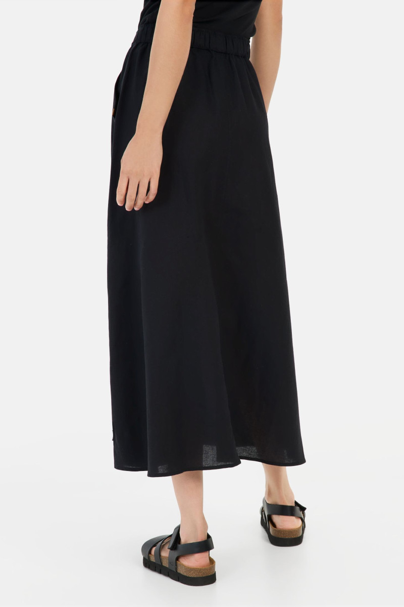 Dámská sukně A střihu s délkou do půli lýtek. Standardní výška pasu, který je pružný, po celé délce předního dílu jsou umístěné kontrastní knoflíky. Jemné a na omak příjemné materiálové složení je při nošení dokonale prodyšné, na těle vyvolává příjemně chladivý pocit. Vysoce komfortní artikl, který se díky svým prvotřídním materiálovým vlastnostem a zpracování, stane okázalou součástí vašeho ležérního šatníku.