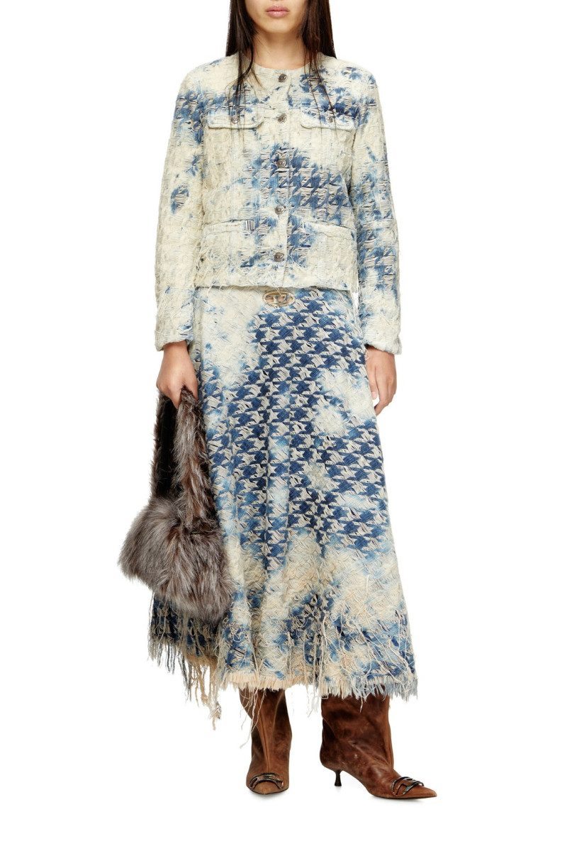 Dámská sukně, která byla představena na přehlídce podzim/zima 2025, má středně dlouhý střih s roztrhanými okraji. Vyřezaná oválná plaketa s písmenem D odhaluje náznak kůže. Praní odhaluje výrazné kontrasty ve světlých a tmavých tónech a vytváří hmatatelný vzor pepito v modré barvě. Laserové techniky, efekty vypalování a celoplošný sprej proti nečistotám zvýrazňují opotřebovanou texturu a volně visící vlákna, což z každého kusu činí unikát. Modelka má na sobě velikost 26 a měří 175 cm.