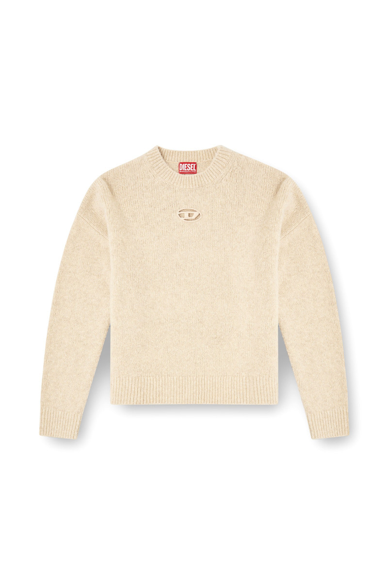 Dámský svetr s kulatým výstřihem. Volný střih s loose fit spadlými rameny. Upleten z měkké směsi bohaté na odpovědně získanou termoizolační vlnu obohacenou o alpaku. Netradiční provedení loga - vyšívané ikonické Oval D na přední straně, odhaluje část kůže nebo jakékoli vrstvy oděvu pod svetrem. Modelka má na sobě velikost S a měří 175 cm. Velikost odpovídá běžnému značení, při výběru zvolte své obvyklé číslo.
