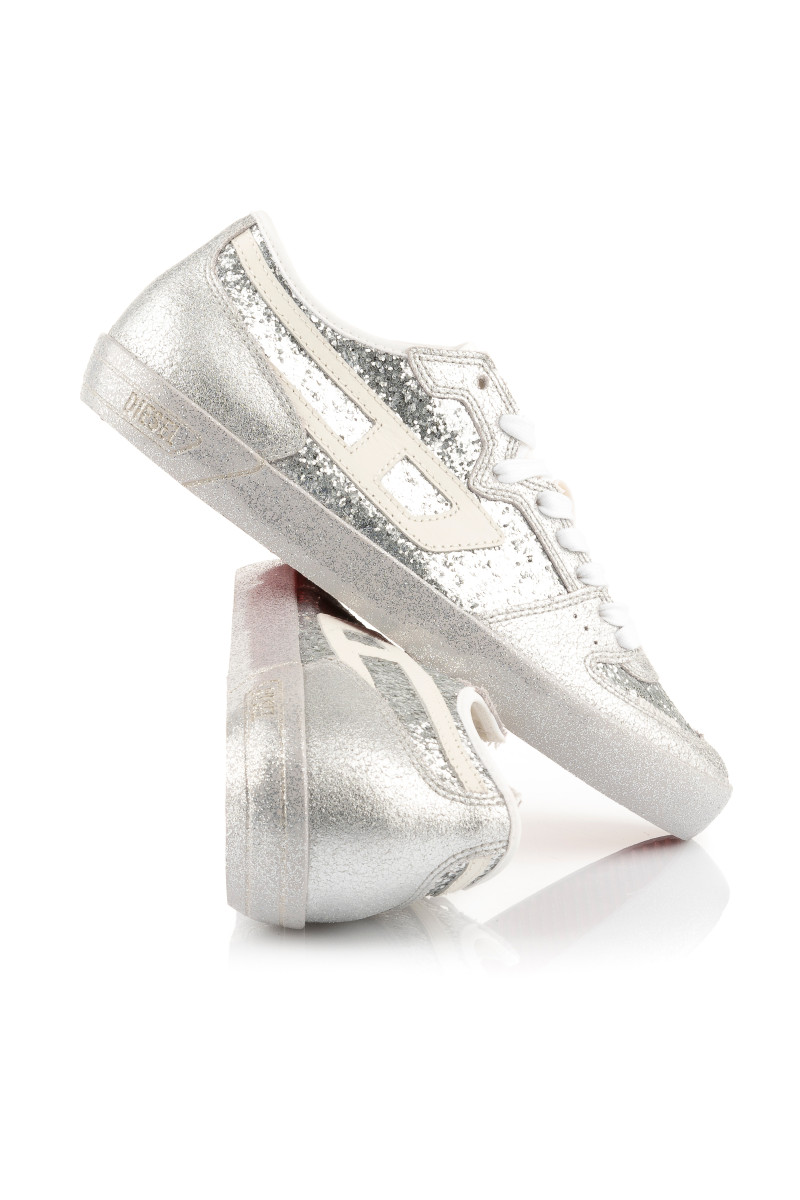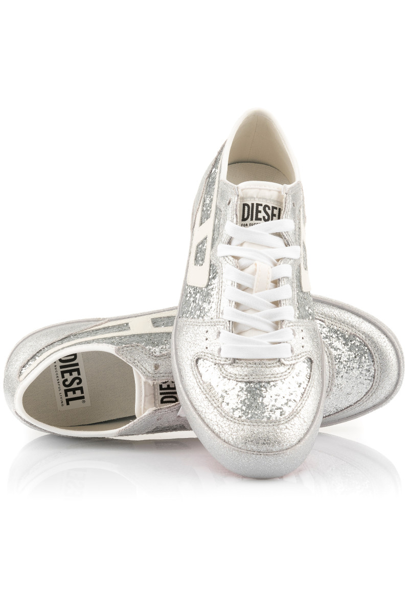 Dámské nízké tenisky. Ležérní design s tkaničkami na zavazování doplňuje bílé logo ve tvaru písmene D, našité na vnější straně. Celoplošné zdobení stříbrnými třpytkami dělá z tohoto modelu nepřehlédnutelný doplněk, který povznese každý váš outfit. Tenisky zdobí červený detail v podobě kontrastní podrážky. Pryžová podrážka v tonální stříbrné je opatřena reliéfním logem DIESEL. Nezaměnitelně stylová a komfortní obuv, která skvěle doladí váš neformální outfit.