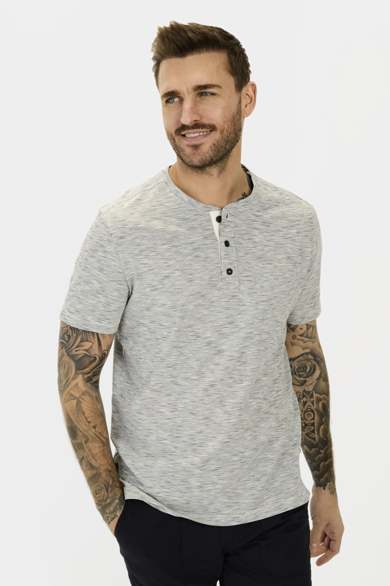 Henley pánské pruhované triko s krátkým rukávem. Kulatý výstřih s légou a třemi knoflíky na zapínání, jedna nakládaná kapsička na hrudi. 100% organic bavlna je dokonale prodyšná, velmi pohodlná a příjemná na omak. Nadčasový artikl, kterým velmi jednoduše a zároveň stylově doladíte jakýkoliv outfit, vhodný ke každodennímu nošení.