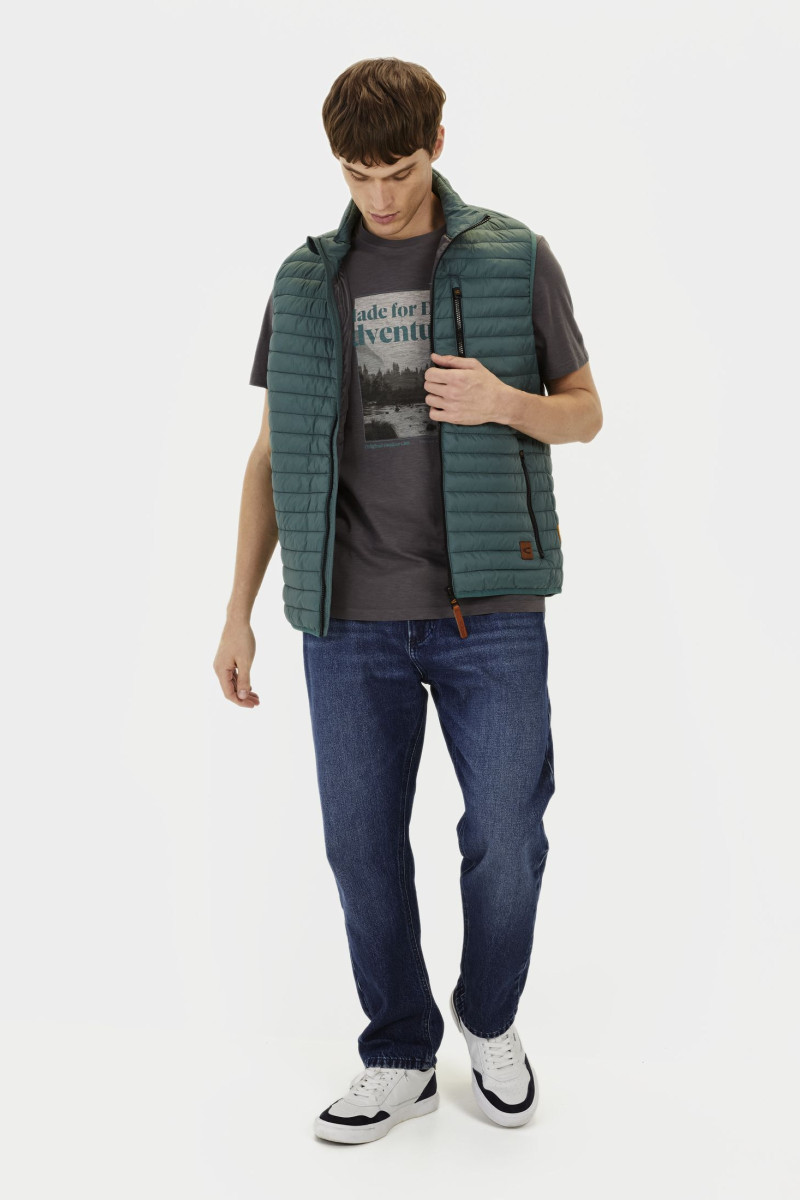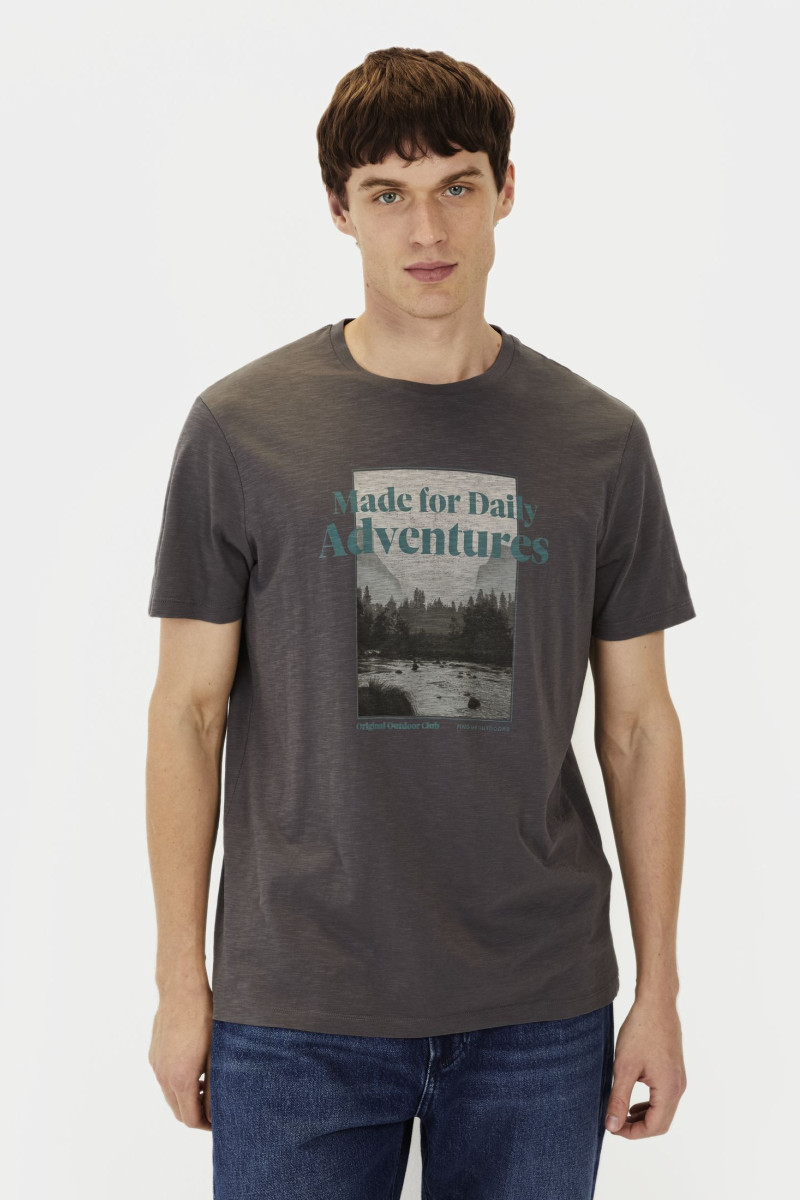 Pánské triko rovného střihu, které zdobí originální fotografický potisk na hrudi. Mírně vyšisovaný design s krátkým rukávem doplňuje kulatý výstřih s žebrovaným lemem u krku a decentní label s logem našitý v bočním švu. Lehké materiálové složení se 100% podílem prémiové bavlny zaručuje dokonalou prodyšnost a maximálně příjemný pocit při nošení. Výborně kombinovatelný a praktický kousek, který stylově doladí váš neformální outfit.