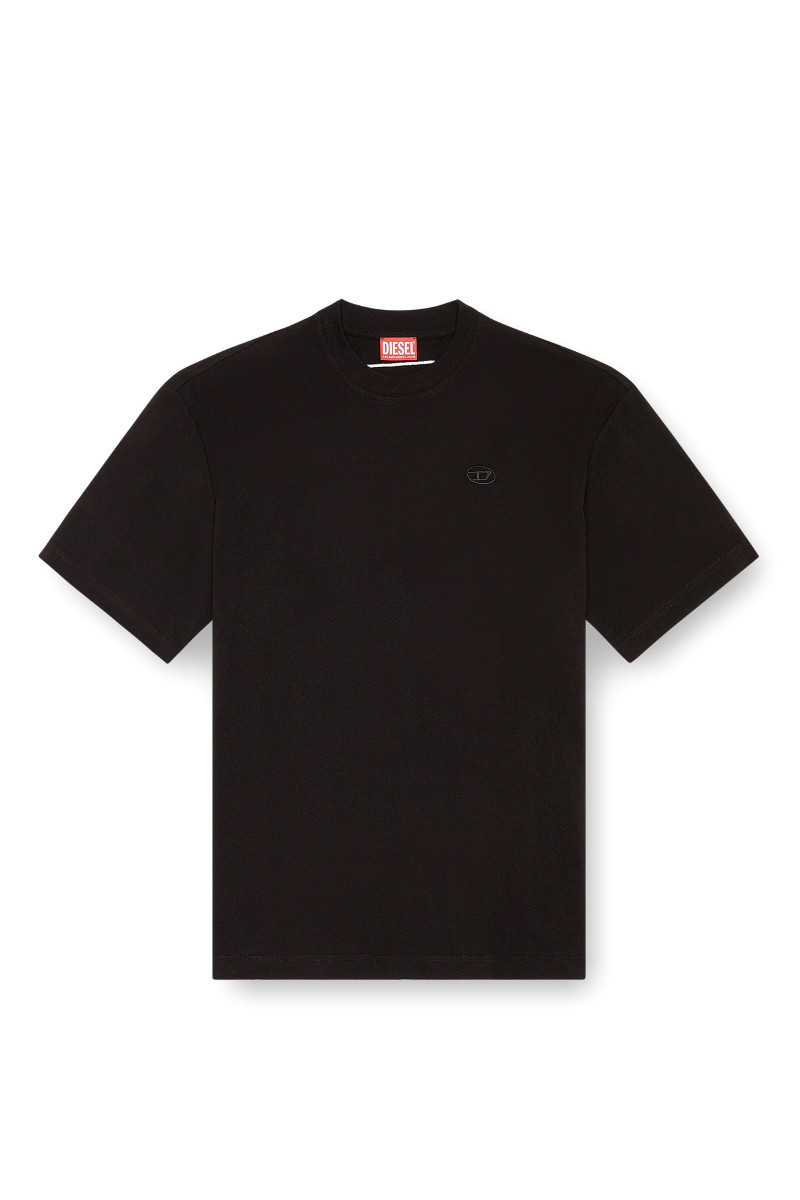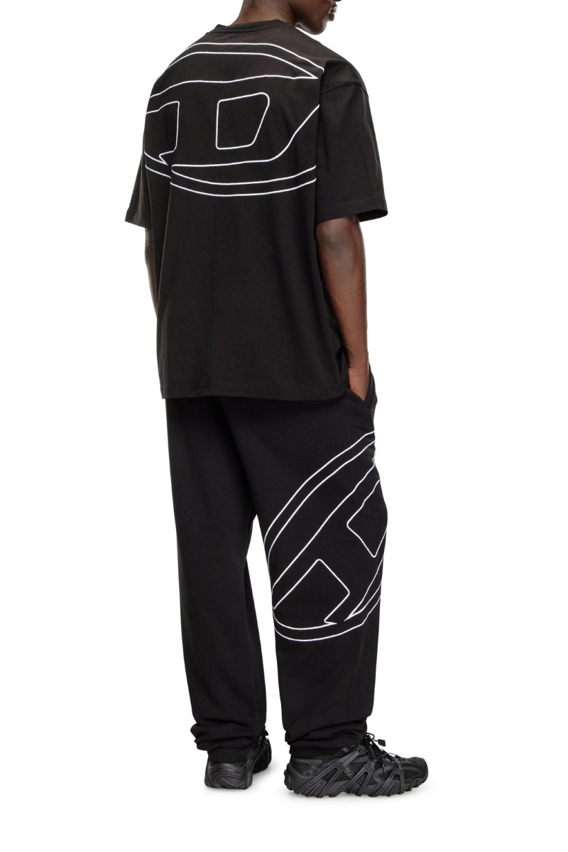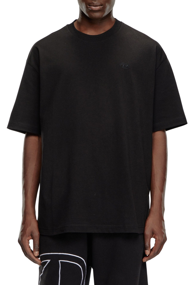 Pánské tričko s krátkým rukávem. Volný oversize střih s boxy siluetou. Žebrovaný kulatý výstřih. Vyrobeno z organického bavlněného žerzeje. Materiál je speciálně upraven. Na zádech zdobí vyšívané kontrastní maxi oválné logo písmene D a na hrudi je totožná malá barevná verze. Model má na sobě velikost L a měří 182 cm.