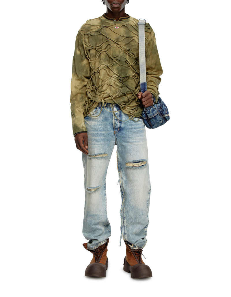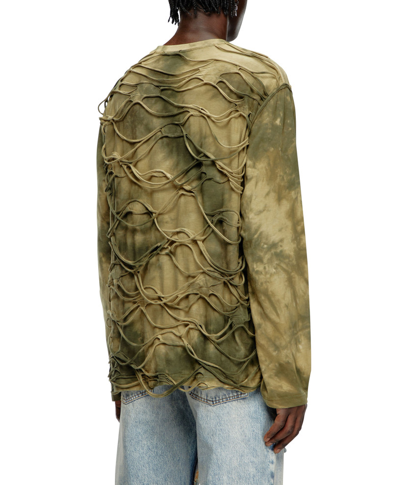 Pánské triko s dlouhým rukávem. Ušito ve volném střihu ze zeleného bavlněného žerzeje. Materiál je ošetřen metodou tie-dye. Hrubě nastřižené proužky svrchní vrstvy visí přes triko tvoří ,,plovoucí" efekt. U krku zdobeno kontrastním drobným vyšívaným logem ve tvaru písmene D. Model má na sobě velikost L a měří 182 cm. Velikost odpovídá běžnému značení, při výběru zvolte své obvyklé číslo.