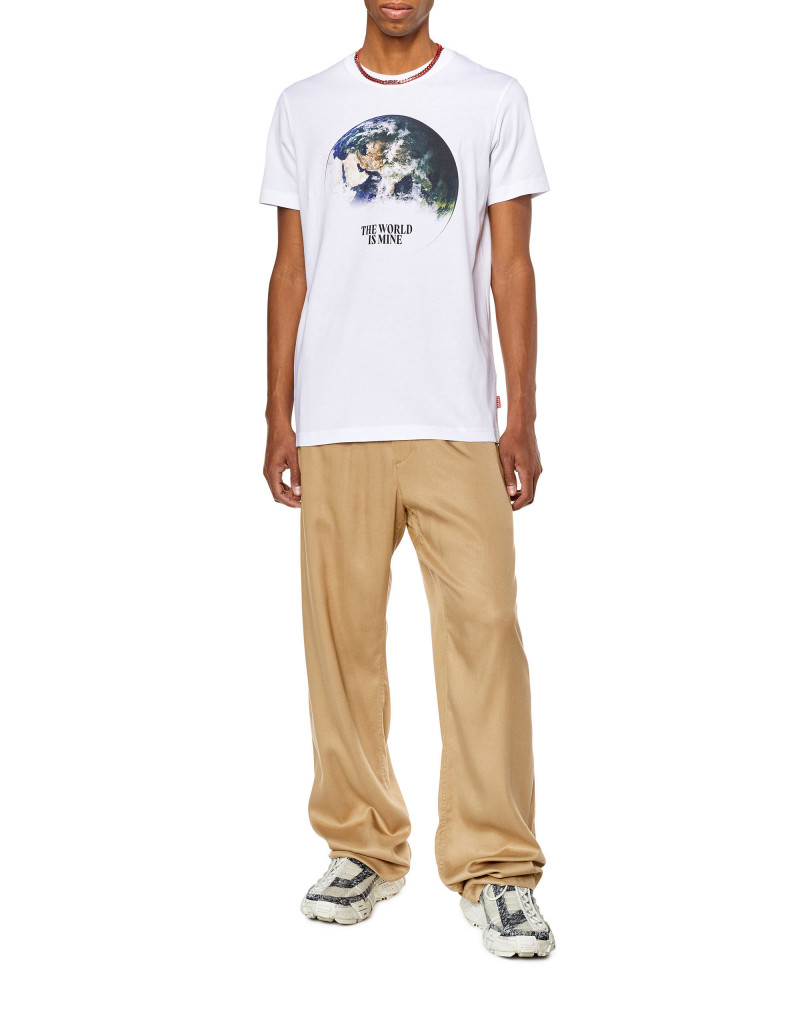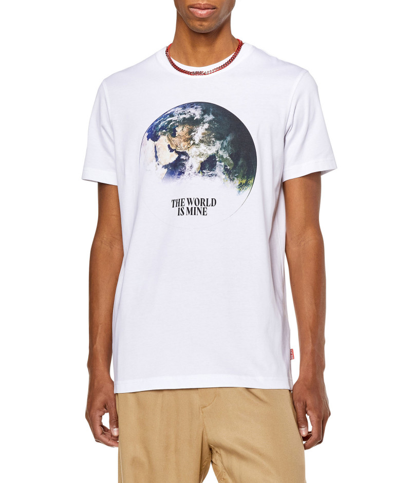 Pánské triko s krátkými rukávy. Ušito v užším slim fit střihu. Vyrobené z měkkého bavlněného žerzeje. Digitálně potištěno grafikou zeměkoule a nápisem „THE WORLD IS MINE“. Zdobeno štítkem Diesel v bočním švu. Model má na sobě velikost L a měří 182 cm. Rozměr odpovídá běžnému značení, při výběru zvolte svou obvyklou velikost.