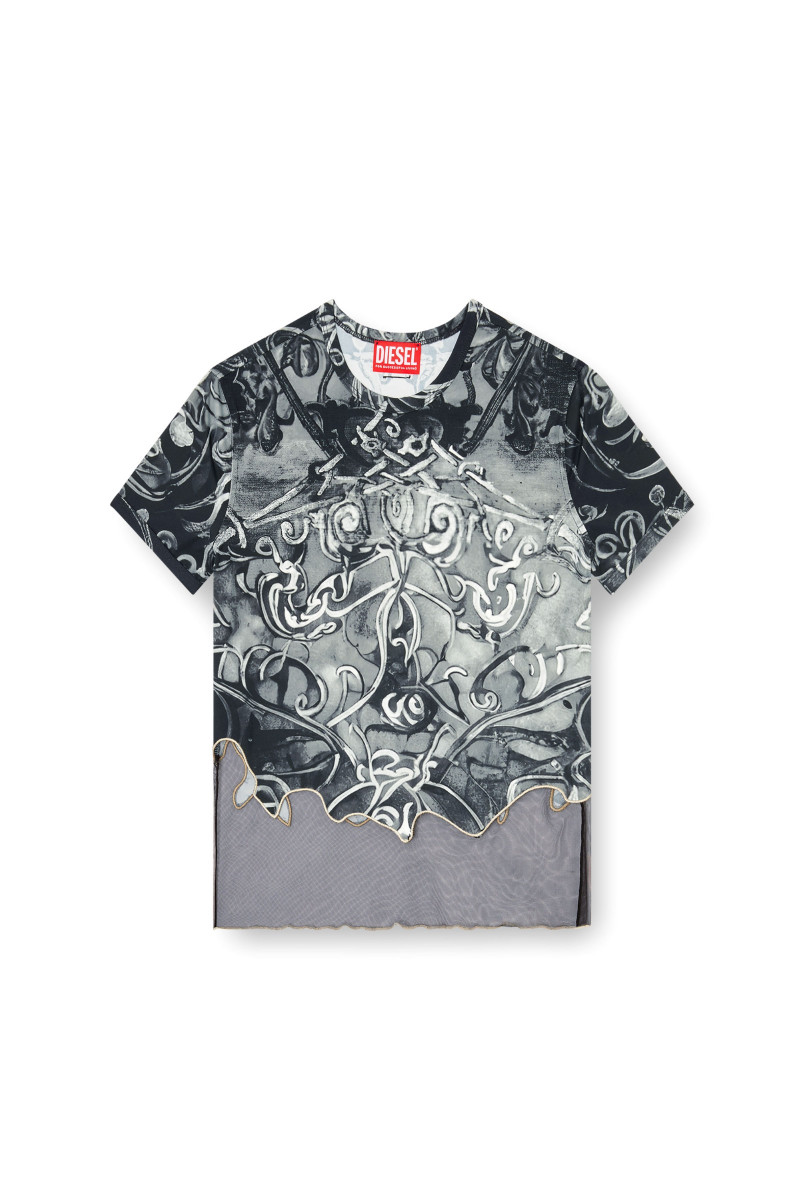 Dámské tričko s krátkým rukávem. Úzký padnoucí slim fit střih. Vyrobeno z potištěného recyklovaného nylonu s heraldickými motivy a atmosférou starodávné tapety. Vlnitý lem kolem spodní strany originálně odhaluje část z průsvitného tylu, která ukazuje kůži. Modelka má na sobě velikost S a měří 175 cm. Velikost odpovídá běžnému značení, při výběru zvolte své obvyklé číslo. Velikost odpovídá běžnému značení, při výběru zvolte své obvyklé číslo.