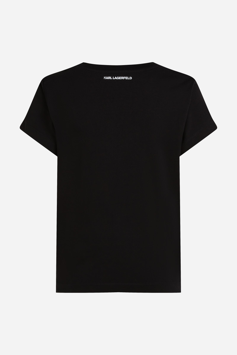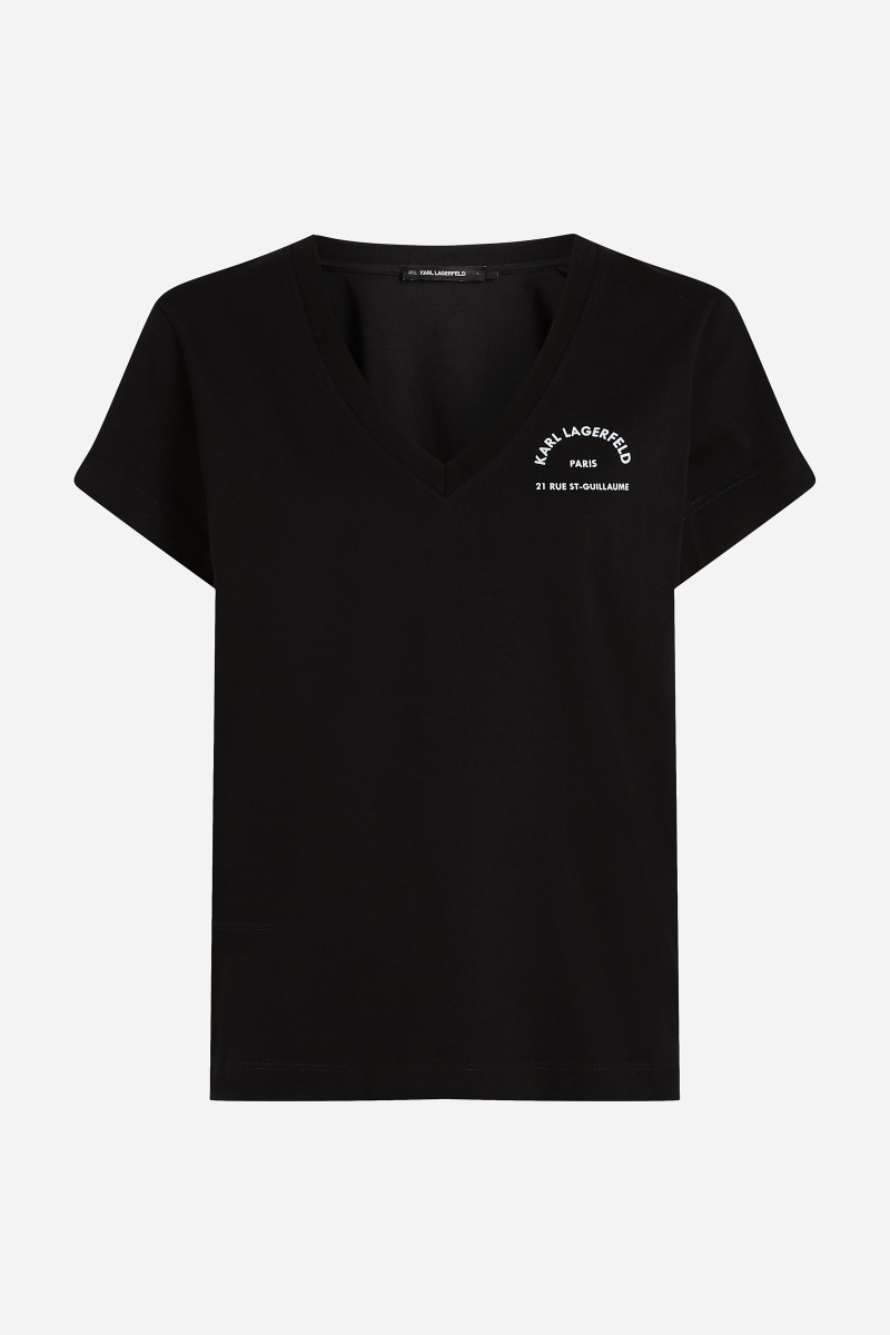 Dámské tričko s výstřihem do V. Rovný střih s krátkým rukávem a žebrovaným lemem u krku doplňuje originální logo Karl Lagerfeld, které je vytištěné na hrudi a na zadní straně. Jemný úplet z prémiové organické bavlny zaručuje maximální prodyšnost, příjemný pocit při nošení a jednoduchou údržbu. Výborně kombinovatelný a praktický kousek, který se stane nezbytným základem Vašeho neformálního šatníku.