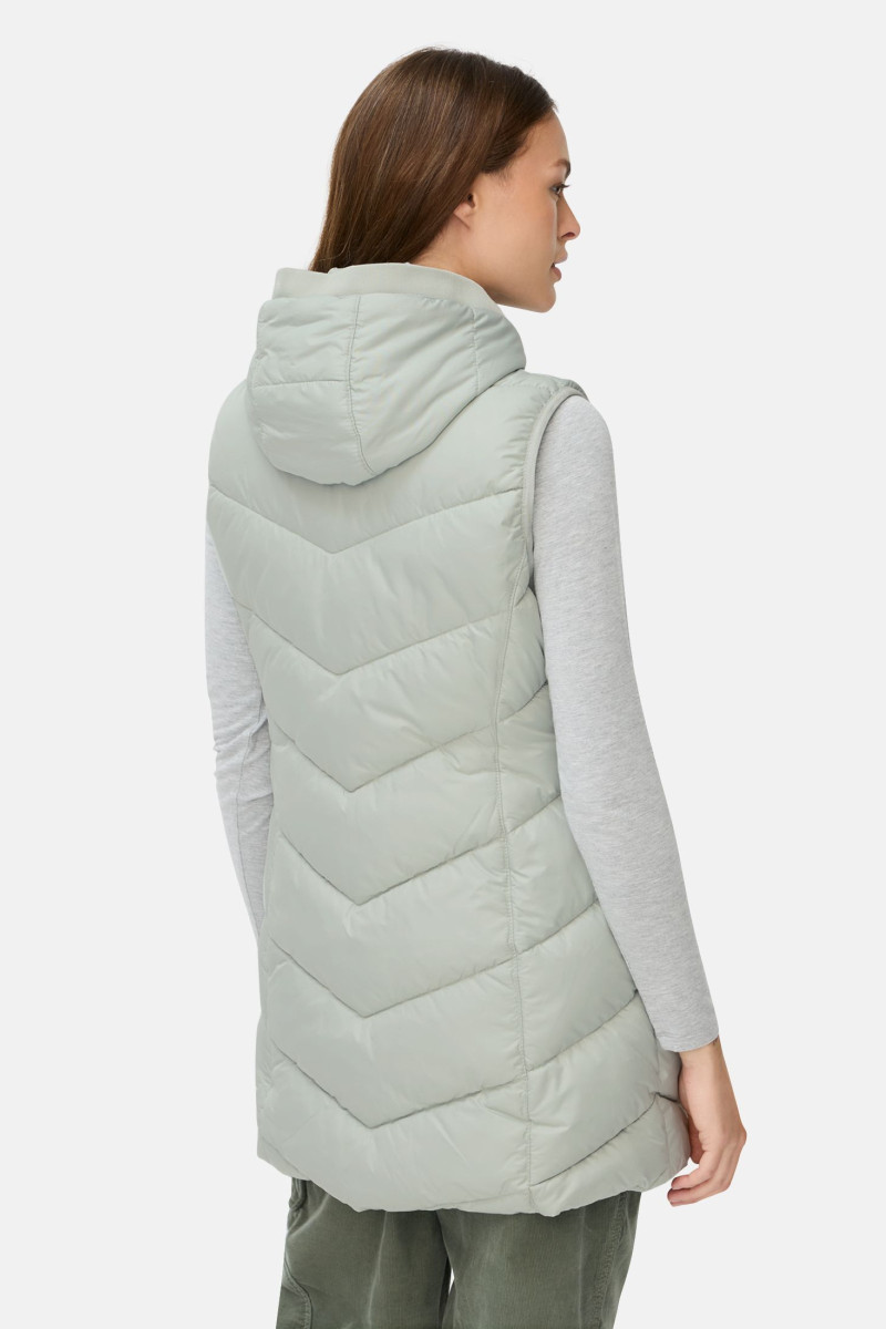 Delší dámská prošívaná vesta s kapucí. Zapínání na dvoucestný zip, elegantně řešené boční kapsy. Inovativní styl prošívání vytváří dokonalou siluetu těla. Materiálové složení včetně lehké výplně zaručuje lehkost, pohodlí a nenáročnou údržbu. Tento praktický a nápaditý kousek dokonale zvýrazní každý váš sportovně laděný outfit.
